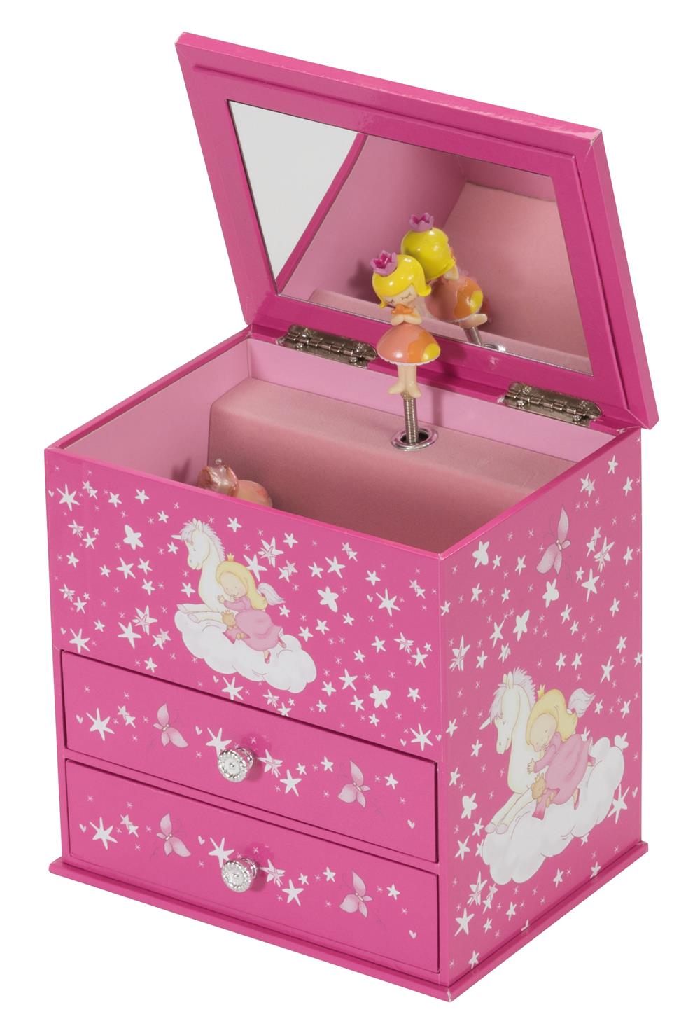 Pretty Stardust Princess design musical jewel case Lift lid with interior mirror Open storage on top Two open drawers Decorative silver-tone drawer pulls Hand lined in pink sueded fabric Size 17x17x13cms Prices shown are per piece not per pack.