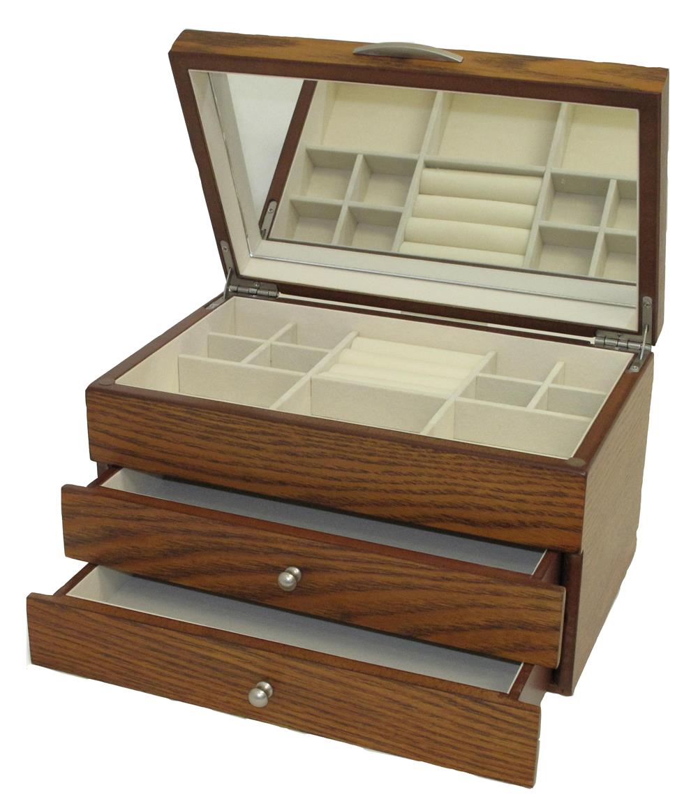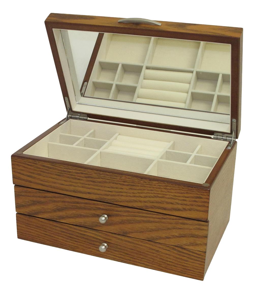 Walnut grain finish Jewel case Full interior mirror to the lid. Compartments and ring rolls in the top section. Two full drawers to the base Fully lined in cream velveteen Brushed chrome effect knobs and lifter 25 x 16 x 14 cms